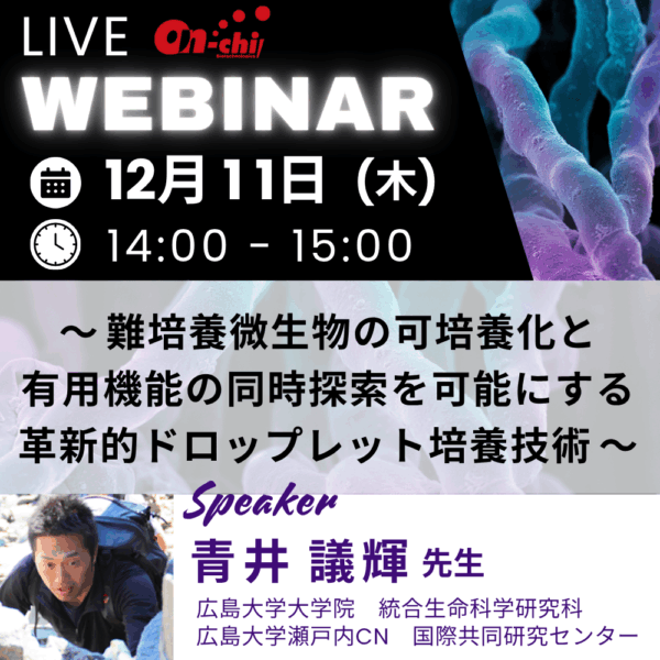 当社主催、ドロップレット技術関連セミナー第8弾!今回は広島大学より青井 議輝先生をお招きし、ドロップレット技術を使った難培養微生物の培養についてご講演いただきます。先生へリアルタイムにチャットで質問もできますので、是非この機会にご視聴いただければと思います。